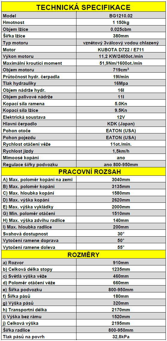 Mini bagry BAUGARDEN BG1210.02 jsou konstruovány a vyráběny s cílem garantovat jejich spolehlivost a dlouhou životnost. Jsou vybaveny špičkovým, vodou chlazeným, 3válcovým japonským motorem KUBOTA D722/E711 o výkonu 10,2kW/2500ot/min splňujícím nejpřísnější emisní limity normy Euro 5, hlavním čerpadlem s průtočností 19l/min, chladičem oleje a motory EATON USA pro pojez a otoč. Čepy i oka pístnic jsou uloženy v pouzdrech a mazací body jsou snadno přístupné.