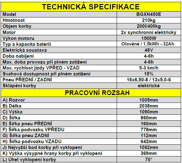 Do korby o objemu 200l je možné naložit až 400 kg nákladu a hydraulický systém zajistí její snadné vyklopení i při plném zatížení.
