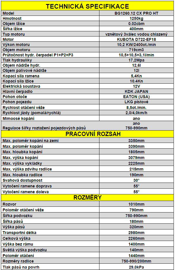 Minibagr BG1260.12 CX PRO HT Kubota lžíce 400mm