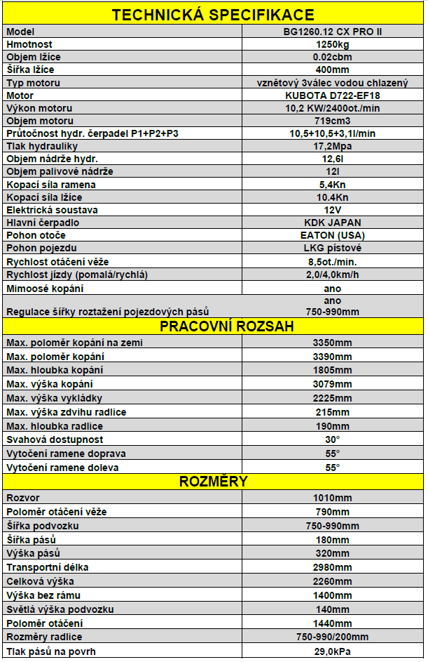 Minibagr BG1260.12 CX PRO II Kubota zvýhodněný set s hydraulickou lžíci 800mm