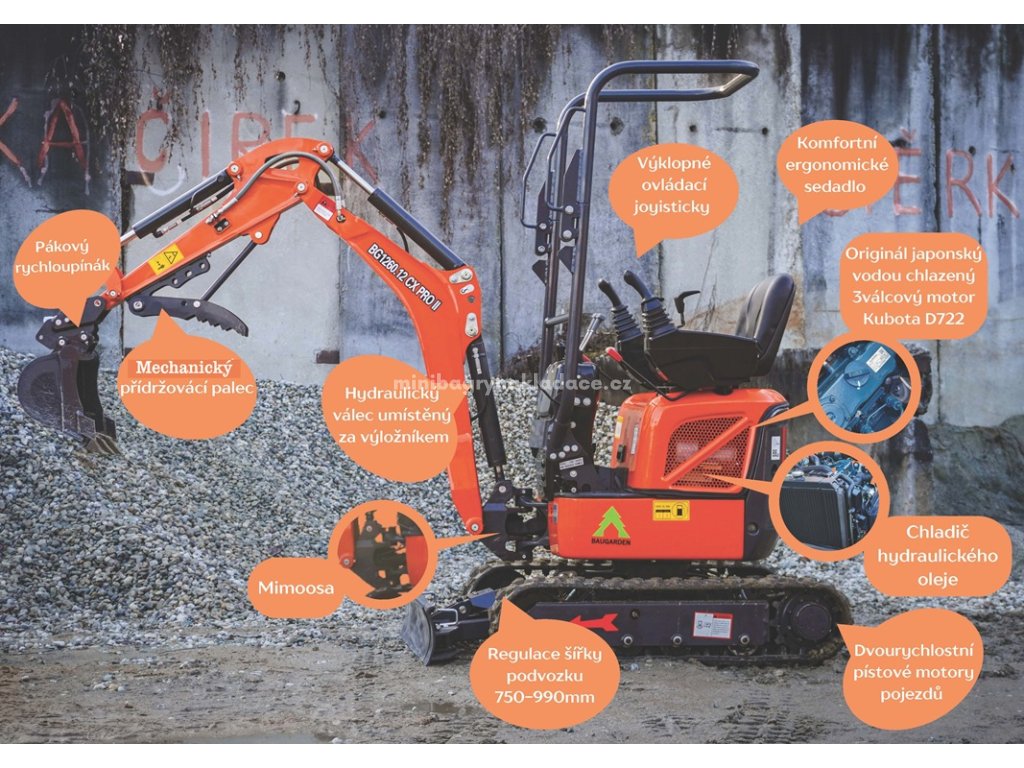 Minibagry BAUGARDEN BG1260.12 CX PRO II jsou konstruovány a vyráběny s cílem garantovat jejich spolehlivost a dlouhou životnost. Jsou vybaveny špičkovým, vodou chlazeným, 3válcovým japonským motorem KUBOTA D722-EF18 o výkonu 10,2kW/2500ot/min splňujícím nejpřísnější emisní limity normy Euro 5, hlavním dvojitým čerpadlem s průtočností 21l/min, chladičem hydraulického oleje a pístovými LKG pohony pro pojezd, díky kterým se může pohybovat rychlostí až 4,0km/h. Čepy i oka pístnic jsou uloženy v pouzdrech a mazací body jsou snadno přístupné.