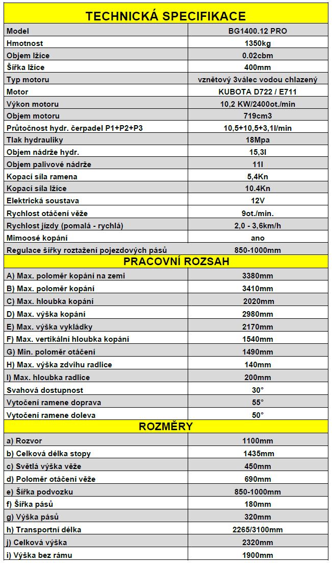 Minibagr BG1400.12 PRO Kubota lžíce 4000mm + přidržovací palec hydraulický