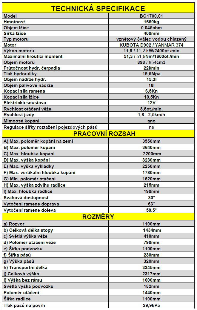 Minibagr BG1700.01 Kubota, lžíce 400mm, Hydraulický přidržovací palec