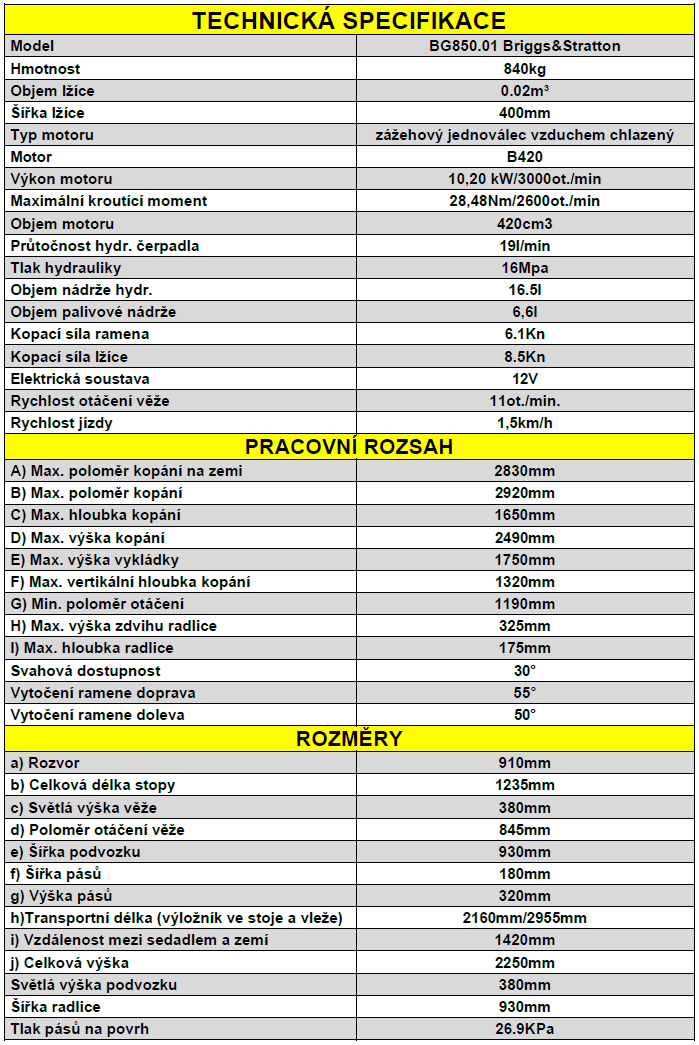 Minibagr BG850.01 B&S zvýhodněný set s pevnou lžíci 800mm
